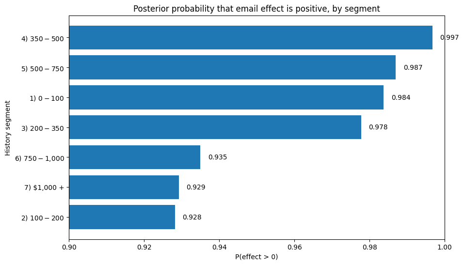 These effects are shown on the log-odds scale from the Bayesian logistic model, so they are useful for relative segment ranking but not yet a direct measure of business lift. I use two complementary views of segment-level treatment effects. The first plot shows the posterior probability that email has a positive effect for each segment, which is useful for suppression or go/no-go decisions. The second plot shows posterior mean treatment effect with uncertainty intervals, which is more useful for prioritizing segments by expected incremental impact.