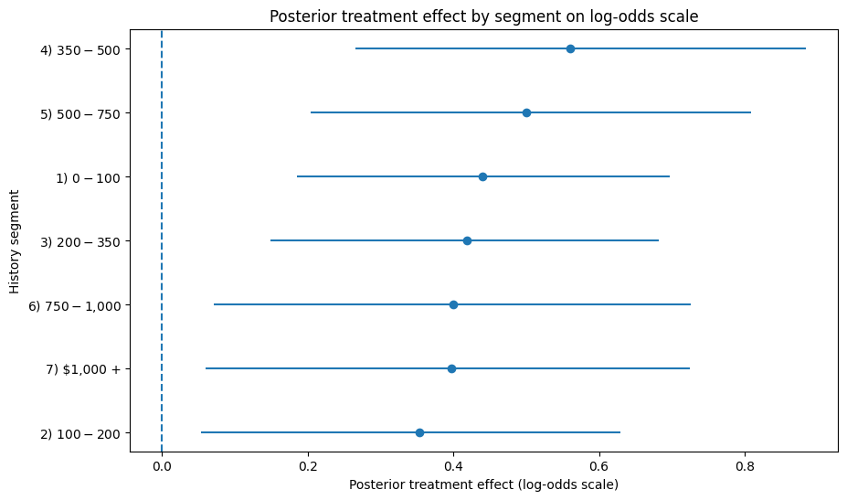 plt.title("Posterior treatment effect by segment on log-odds scale")