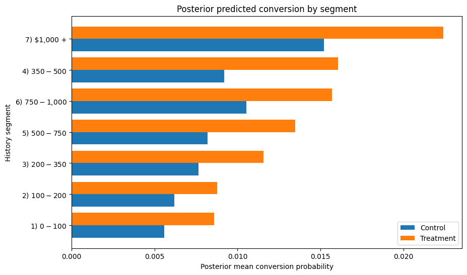 Rather than ranking segments purely on treatment effect coefficient size or raw observed lift, I convert posterior segment effects into expected conversion under treatment and control. This makes the output directly useful for decisioning: it tells me not only whether a segment is likely to benefit, but also how much incremental conversion I should expect if I target it.