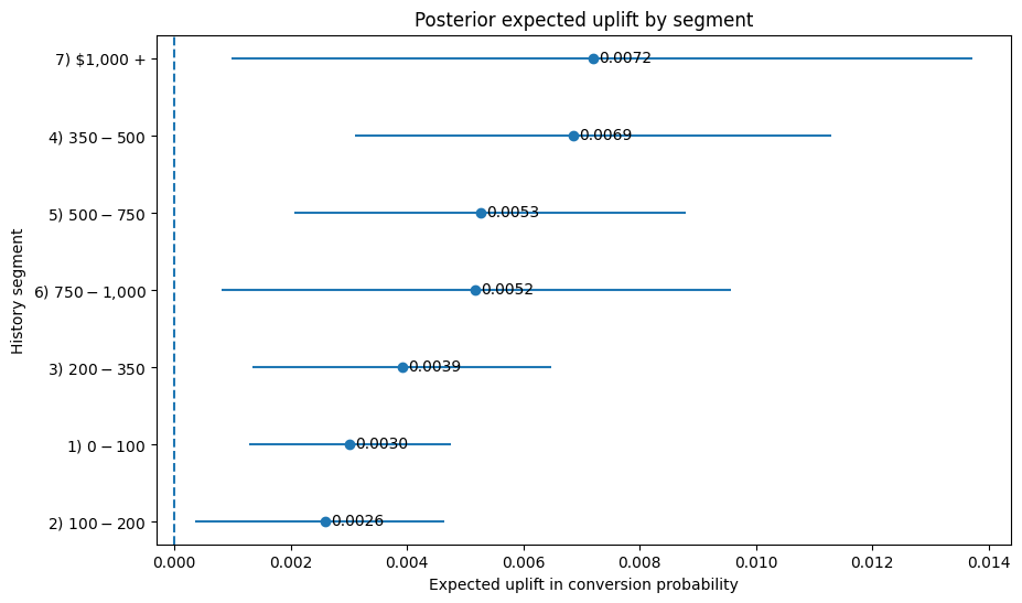 This plot translates posterior treatment effects into expected incremental conversion by segment, which is more directly useful for campaign prioritization than coefficient estimates on the log-odds scale. The point estimate shows expected uplift, while the interval reflects posterior uncertainty.