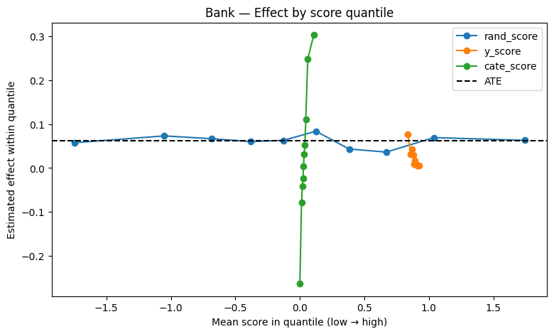 print("Bank pseudo-outcome weighted MSE:", pseudo_outcome_wmse_report(bank_scored))