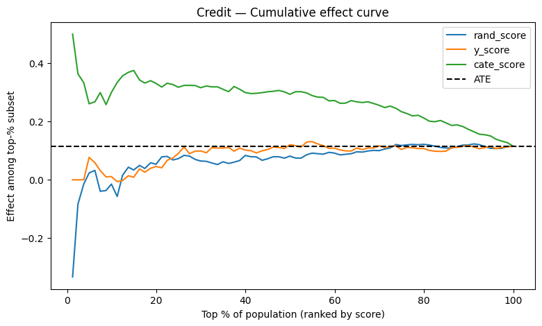 plot_cumulative_effect(credit_scored, title="Credit — Cumulative effect curve")