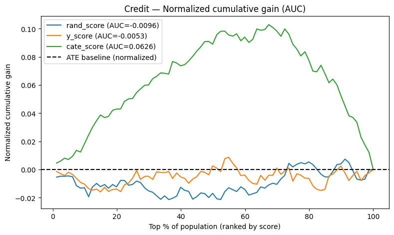 credit_aucs = plot_cumulative_gain(credit_scored, title="Credit — Normalized cumulative gain (AUC)")