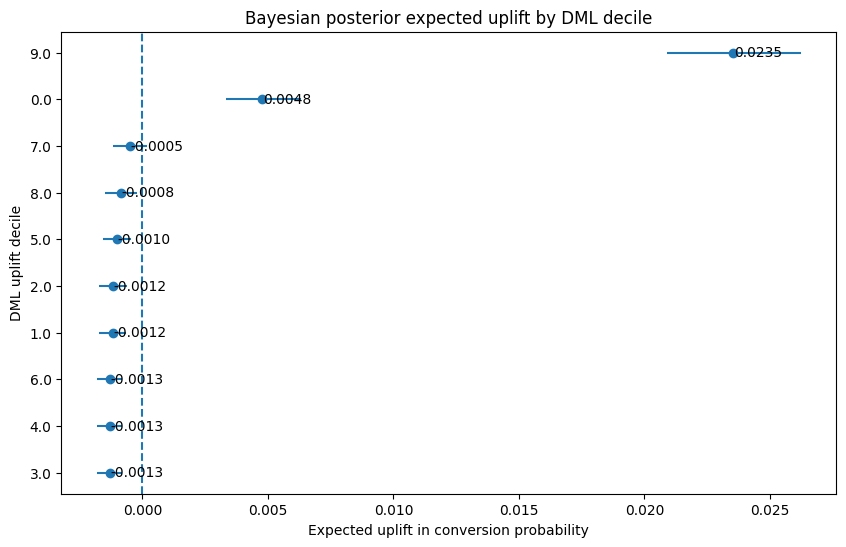 - Decile 0 flips the story. DML treats it as the worst bucket, but the Bayesian layer sees a meaningfully positive uplift with very high confidence in the sampled data.