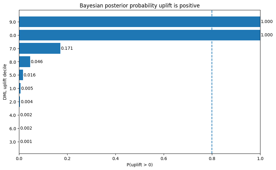 - Decile 8 ranked second by DML, but the Bayesian layer gives it negative posterior mean uplift and only about 4.6% probability of positive uplift.